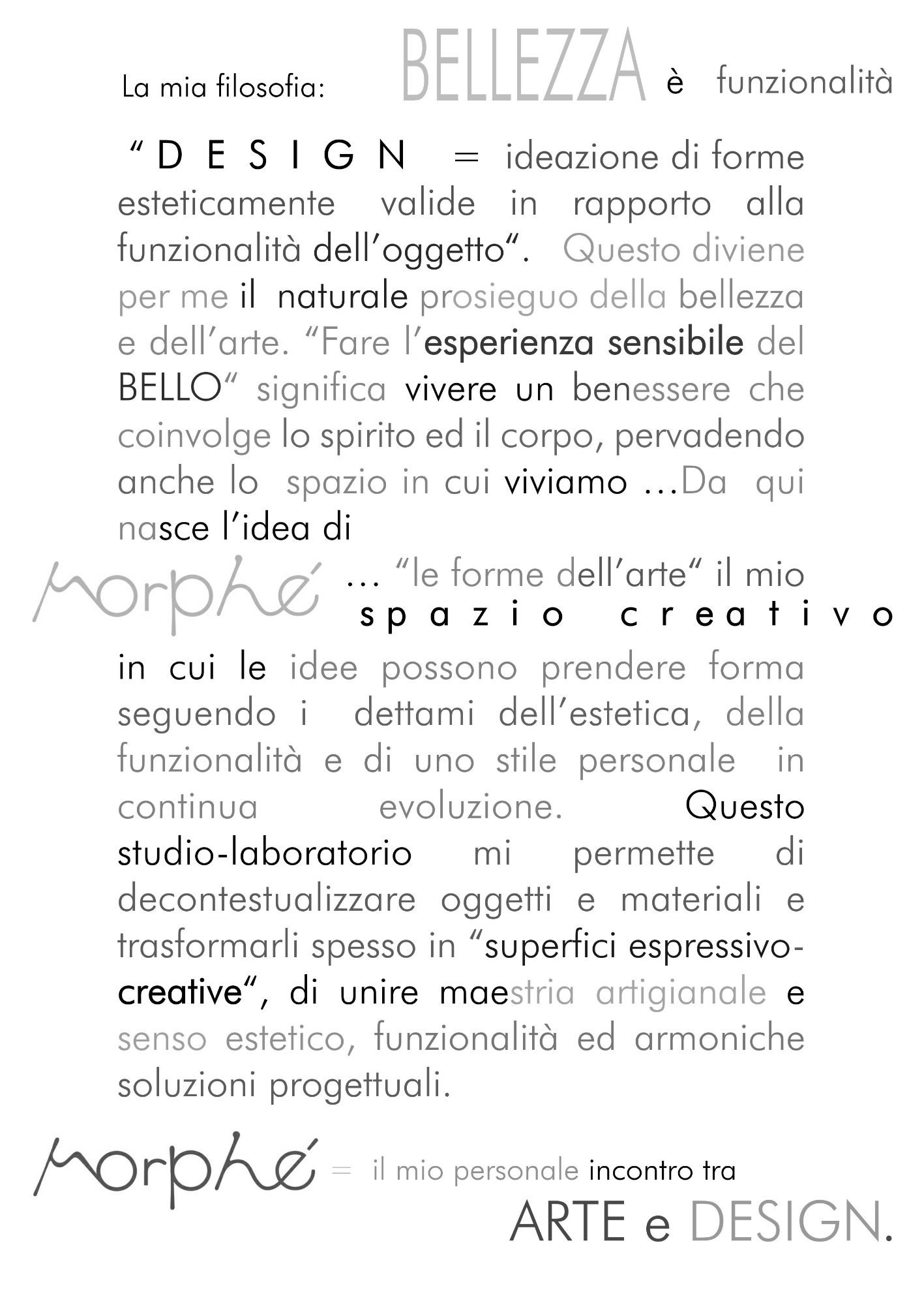La sua ricerca artistica si esprime spesso con installazioni che interagiscono con l’ambiente, permeando di sé lo spazio circostante. Crea anche lo studio-laboratorio “Morphé“, un luogo innovativo che permette alle sue idee di prendere forma ed esprimere il connubio tra Arte e Design: la bellezza che entra nel quotidiano e diviene funzionalità.